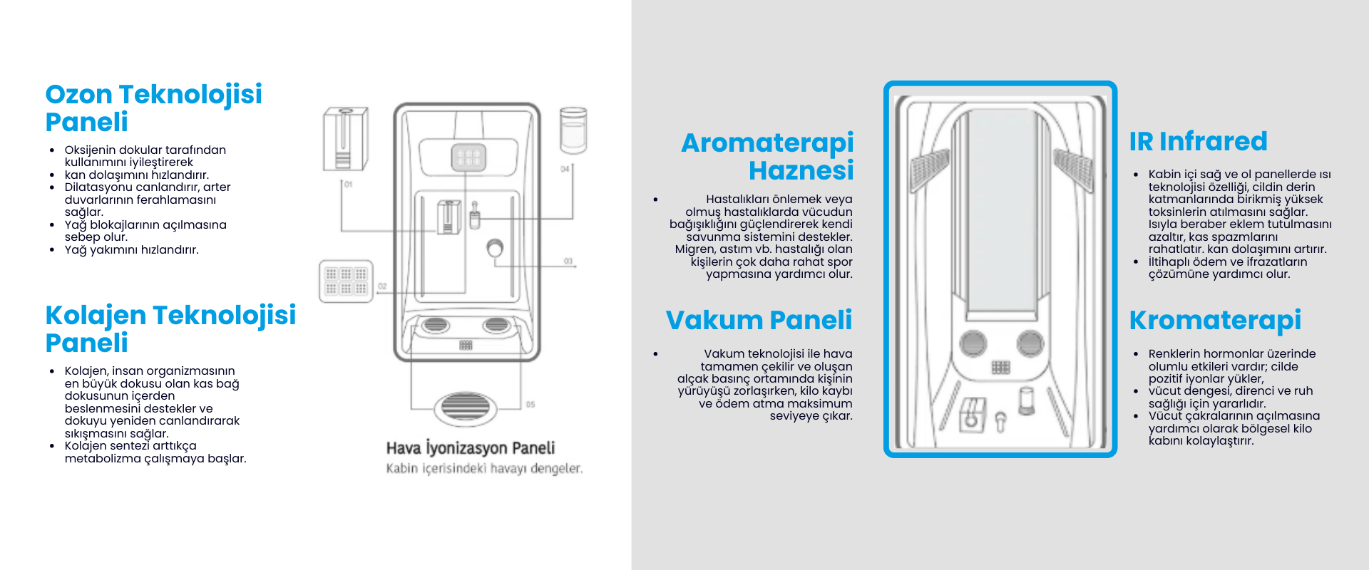 The heat technology infrared feature on the right and left panels inside the cabin helps eliminate high levels of toxins accumulated in the deep layers of the skin; along with the heat, it reduces joint stiffness, relaxes muscle spasms, and improves blood circulation. It relieves pain and aids in healing soft tissue injuries. Additionally, it helps reduce inflammatory edema. Through sweating, it assists collagen and ozone in penetrating the deeper layers of the skin via opened pores.